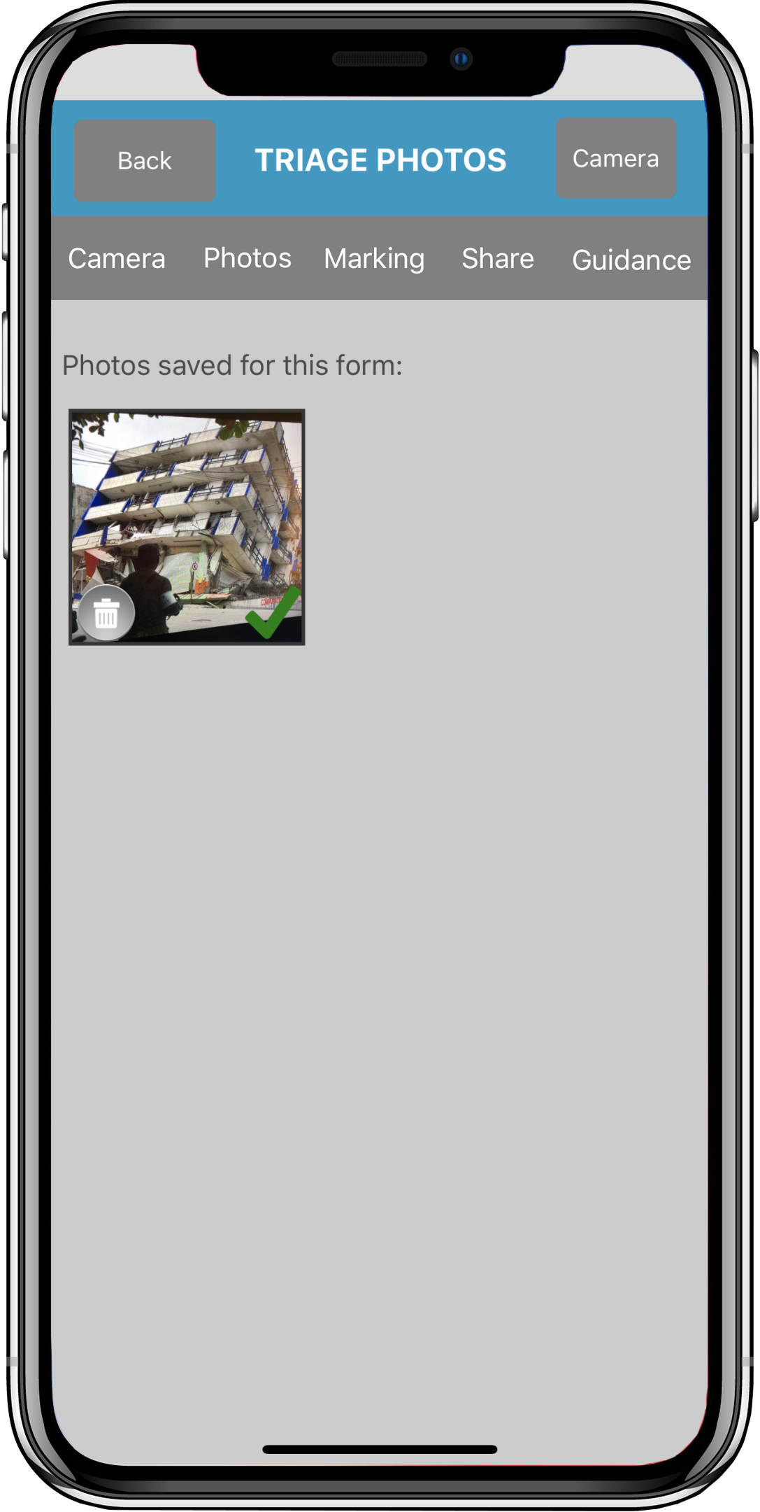 The Worksite Triage forms help gather preliminary data during initial review of a disaster worksite. The forms comply with United Nations INSARAG worksite triage forms. The home screen for your worksite forms displays a checkbox to indicate which forms to upload when the ‘Upload’ button is pressed and top level info on the form including: Worksite ID, Triage Category, Date, and Lat/long of the worksite. Each form has the ability to add multiple photos taken with the app, generate a search marking, some general INSARAG guidelines for the form, as well as the ability to share the form via URL link to another Disaster Surveyor app user, or, if clicked outside of the app by the recipient, to see the full PDF version of the report along with any attached photos and sketches. When a data signal is not available, changing the settings to “Offline mode” switches the sharing from URL link, to a text JSON packet that will share the form via Bluetooth to another Disaster Surveyor app user. Automatic identification of which user, what GPS lat/long, and what team ID are automatically saved upon form creation, for use in team group management in the Commander Edition web-based dashboard.